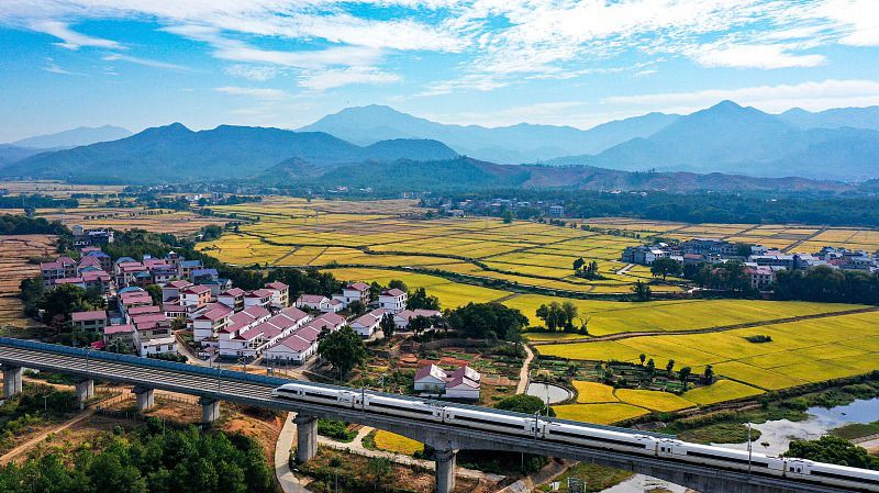 2022年10月20日,江西吉安,吉水县醪桥镇磨下村,一列高铁在金色田野中飞驰而过。进入晚稻收割季,江西省吉安市吉水县处处大地金黄,呈现出一派丰收景象。