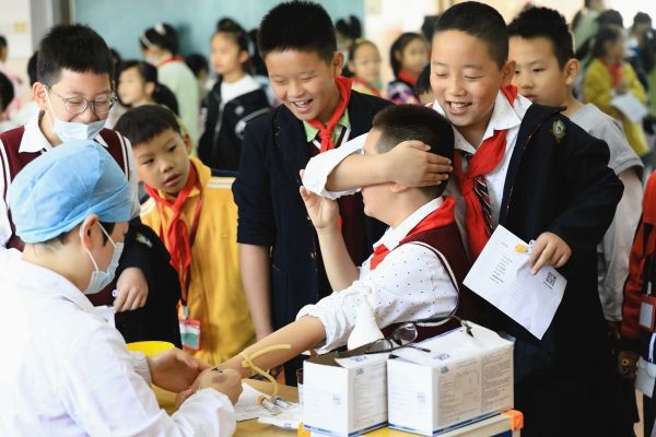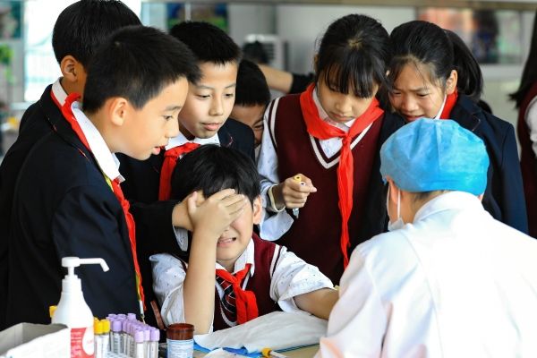 2022年10月21日,浙江湖州,长兴县实验小学,妇幼保健院医务人员正在为学生抽血体检,学生们丰富的“表情包”让人忍俊不禁。