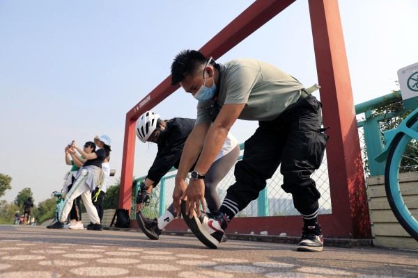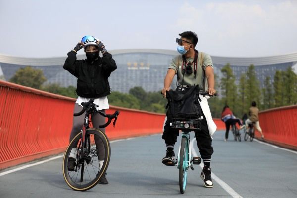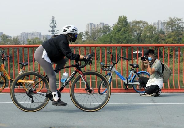 2022年10月18日,成都,“陪骑者”罗洋和顾客在骑行途中休息。随着骑行运动的流行,成都天府绿道每天都会迎来许多市民和骑行爱好者,名为“绿道陪骑服务”的项目也悄然兴起。服务项目主要包含“技术支持”“全程后勤”“门到门接送”“视频跟拍”“上桥帮忙推车”等。 中新社记者 王磊 摄
