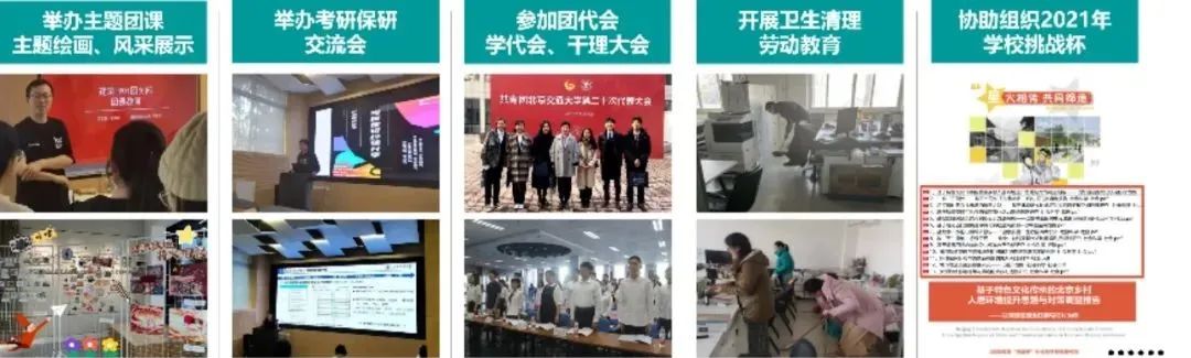 2020年9月至今,华建嘉作为学院学生兼职团委副书记组织各团支部开展主题团课、纪念主题绘画和团支部风采展示等活动,号召同学们用画笔描绘学习成果,展现新时代青年对革命精神的继承与弘扬。同时,他还作为骨干参与组织开展学院共青团中央“青年大学习”、北京交通大学第十届创意文化节、卫生清理劳动教育、考研保研交流会,作为学校团员青年代表,他参加团代会、学代会,积极建言献策,维护学生权益、服务学生生活。