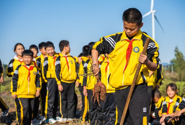 2022年10月17日,河北邢台,柏乡县西汪中心小学学生在老师的指导下,走进农田清理红薯蔓,收获红薯。
