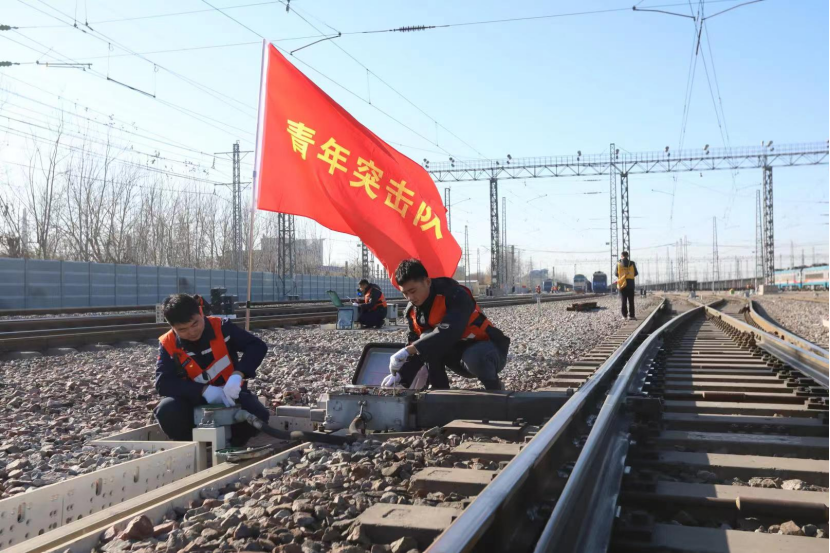 国能朔黄铁路肃宁公司肃宁北电务工队青年职工检修道岔作业。