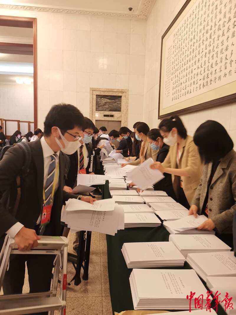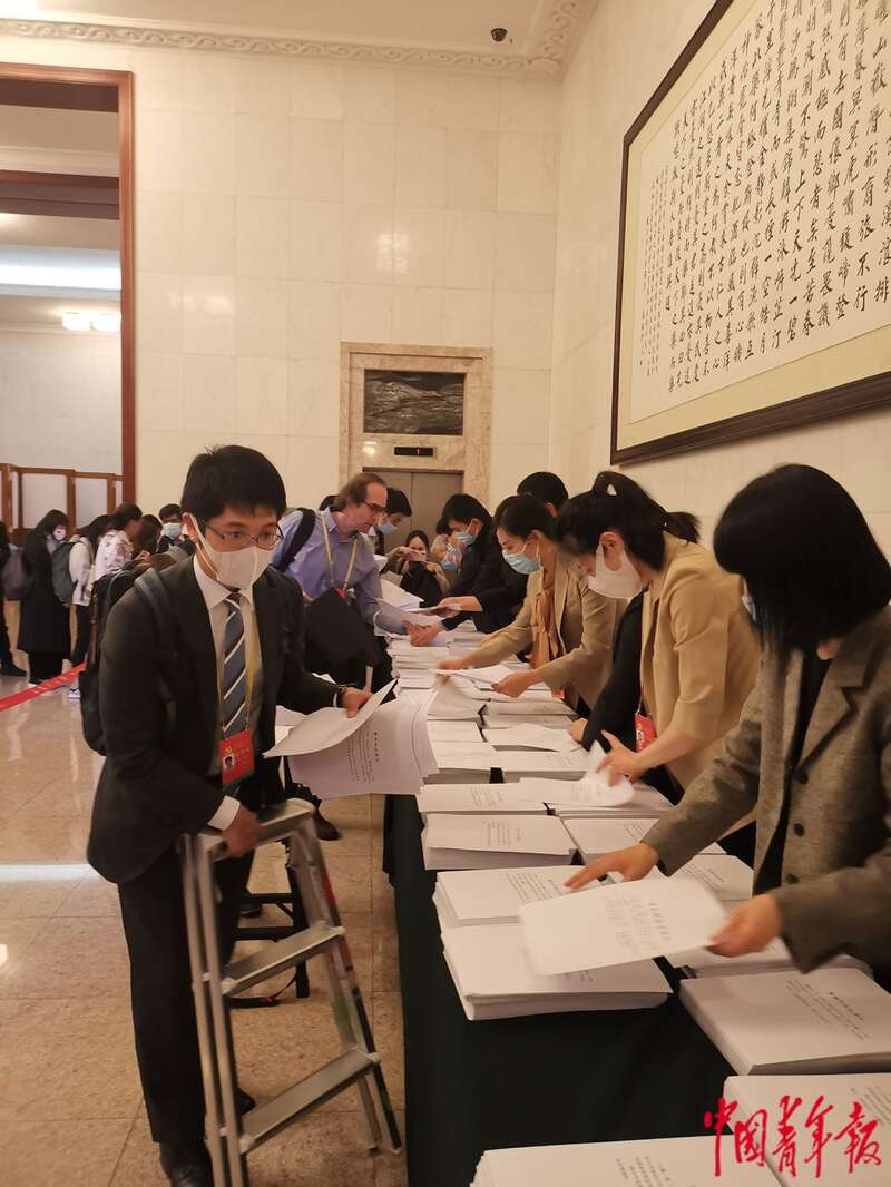 中国青年报客户端北京10月23日电(中青报·中青网记者 张国)中国共产党第二十届中央政治局常委同中外记者见面会后,记者们排队领取新一届中央政治局领导的简历。简历是中英文两种语言。