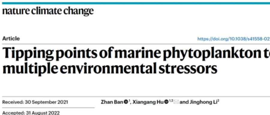 相关成果以“Tipping points of marine phytoplankton tomultiple environmental stressors”为题发表在著名学术期刊Nature Climate Change上。