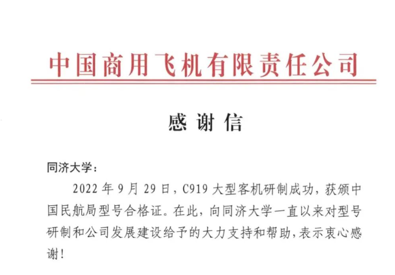 近日,同济大学收到中国商用飞机有限责任公司发来的感谢信。来函说,今年9月29日,C919大型客机研制成功,获颁中国民航局型号合格证。衷心感谢同济大学在大飞机科技创新、校企人才培养、科研合作等方面给予大力支持和帮助,为推动C919大型客机研制、取得型号合格证作出了重要贡献。