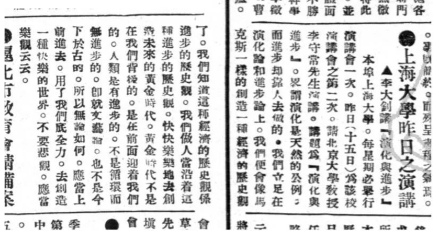 △1923年4月16日第三张第十一版上海大学昨日之演讲:李大钊讲“演化与进步”