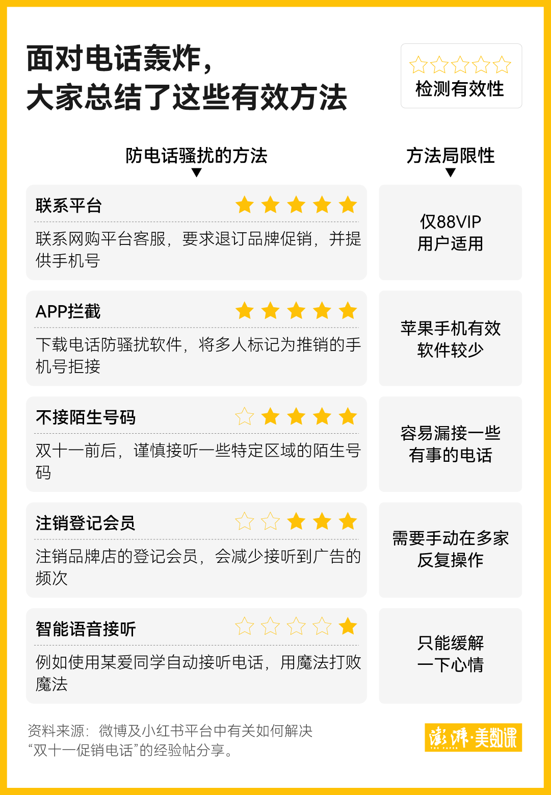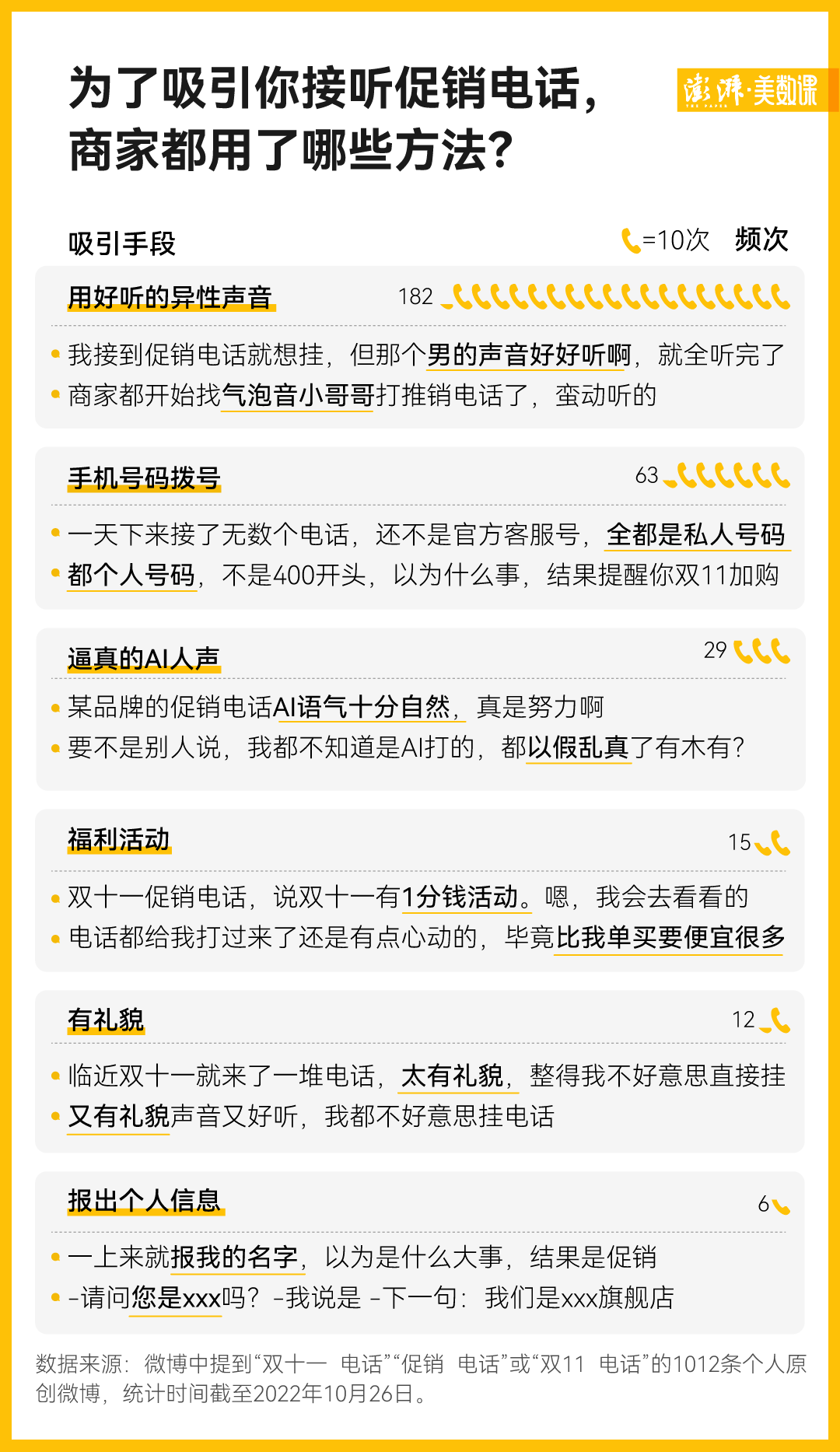 澎湃新闻收集并分析了社交媒体上一千多条提到“双十一”营销电话的帖子,看看大家是如何评价这波疯狂的促销来电的。