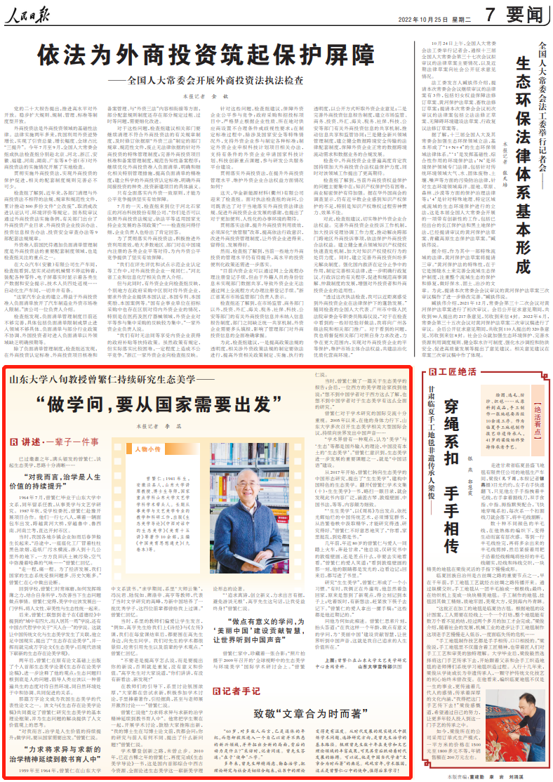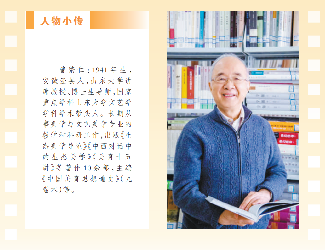 曾繁仁1964年毕业于山东大学中文系,同年留系任教,从事美学与文艺学研究。他强调生态问题归根到底是人的问题,倡导人类应该以一种普遍共生的态度对待自然环境,同自然环境处于一种中和协调、共同促进的关系。多年来,曾先生殚精竭虑、勤奋治学,为“美丽中国”建设贡献智慧,让世界听到中国的声音。
