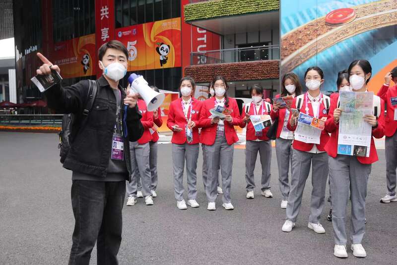 这组20名“小叶子”中,除了16位一年级“小叶子”,3位二年级“小叶子”,还有一位资深“小叶子”——朱开明。这名“00后”已是第四年参加进博会志愿服务工作。他给一年级“小叶子”分享记路心得:“先记东南西北四个方位,再记1-8馆位置,把地图放在心里,一般指路就不难。”