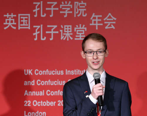2015年10月22日,英国伦敦,康可在英国孔子学院和孔子课堂年会开幕式上朗诵中文诗词。新华社记者庞兴雷摄