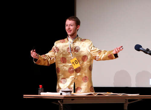 2015年3月21日,第14届“汉语桥”世界大学生中文比赛全英大区中,选手康可表演创意书法。新华社记者韩岩摄