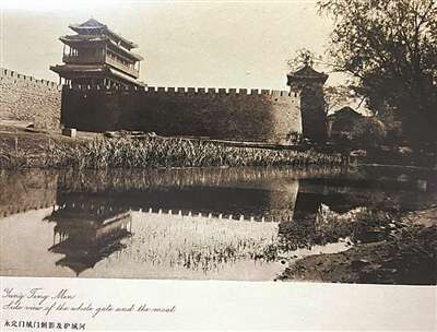 喜龙仁拍摄的永定门城门侧影及护城河
