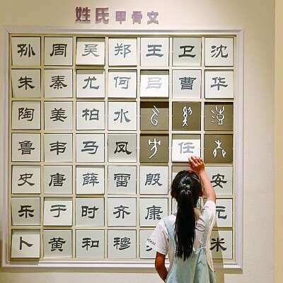 小朋友在山东省博物馆体验姓氏甲骨文翻转展板。