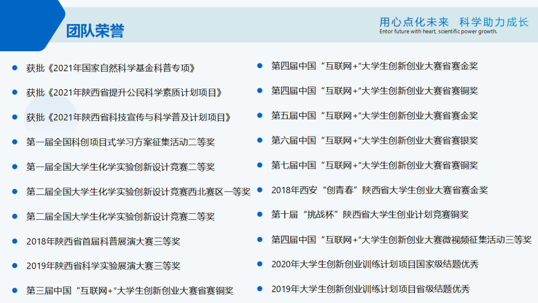 同时,化未来科普实验室师生积极投身各类创新创业大赛,取得了不俗的成绩: 获国家级及省部级奖励18项 ,包括第一届全国大学生化学实验创新设计竞赛二等奖,“互联网+”及“创青春”省赛金奖,创青春陕西省大学生创业大赛优秀指导教师奖,获得“陕西科普使者”称号,国家级大学生创新创业计划项目获得结题优秀。