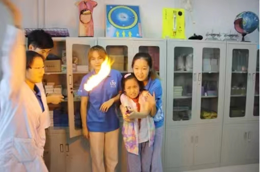 2021年前往富平县杜家小学参加“三下乡”暑期实践活动时,团队成员为当地儿童展示了绚丽的火焰魔法,通过通俗的语言讲述其中化学原理,完成了一场浪漫的化学科普。