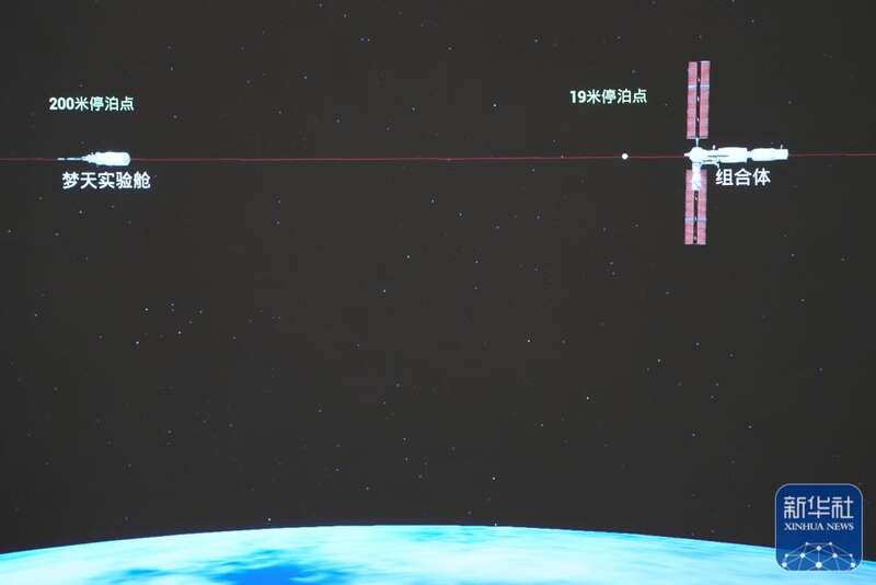 11月1日在北京航天飞行控制中心拍摄的空间站梦天实验舱与空间站组合体在轨完成交会对接。这是梦天实验舱从200米停泊点向19米停泊点靠近的模拟图像。新华社发(孙丰晓 摄)