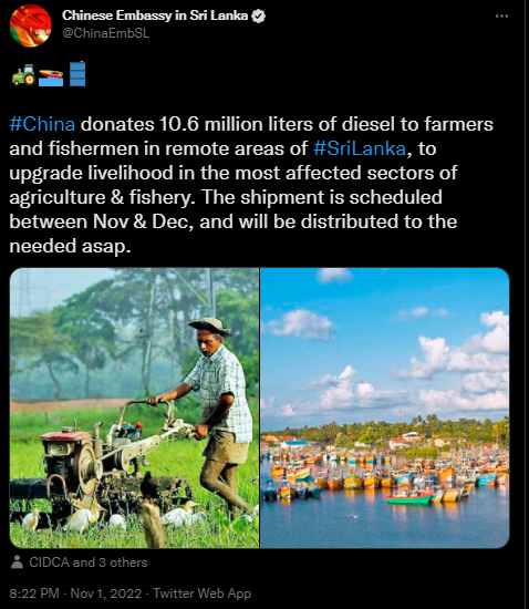 针对此种困境,中国驻斯里兰卡大使馆11月1日在推特发文,宣布中方将向斯里兰卡偏远地区的农民和渔民捐赠1060万升柴油,以改善他们的生计。