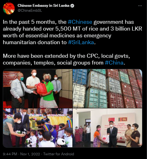 大使馆在推文下方还附上了近期中国政府向斯里兰卡提供援助的照片,表示“最近5个月,中国政府已经向斯里兰卡捐赠了5500吨大米和价值30亿斯里兰卡卢比的基本药物,以作为紧急人道主义援助。中国地方政府、公司、寺庙等也为斯里兰卡提供了援助。”