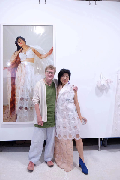 今年7月,德国柏林“人性-艺术立场-中国”大型艺术展览,展出了黄梅的造口袋作品,以及摄影照片——黄梅穿着造口袋服装,躺在造口袋铺满的地面上,观众可以亲手感受造口袋的触感。