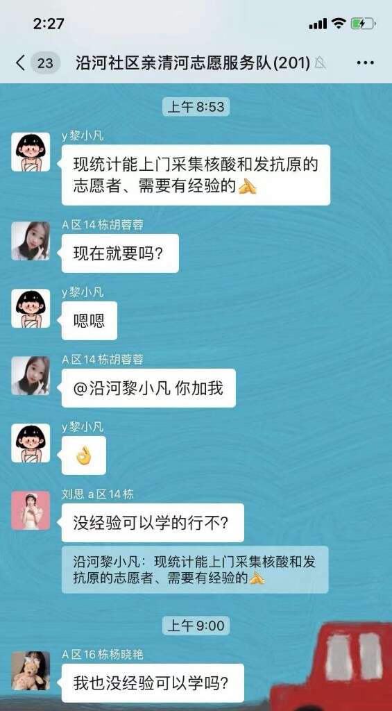 “现在需要能上门采集核酸和发抗原的志愿者,要有经验的!”10月29日一大早,沿河社区年轻工作人员黎小凡在社区亲清河志愿服务队微信群内发了这样一条招募信息。