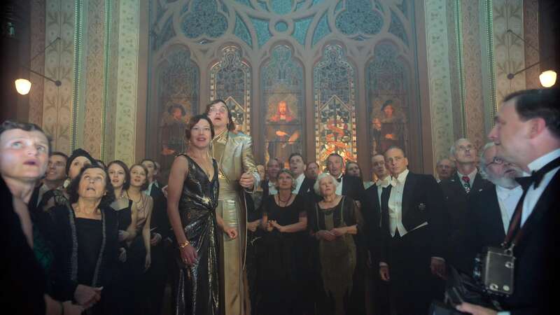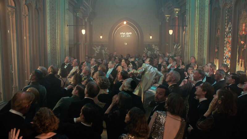 望着升空的火箭,尼尔森湛蓝的眼睛几乎变得透明。他左眼下的紫红色胎记与口鼻的黑洞预告不详。火箭爆炸时,人群一致向后仰身。管弦乐响起,银发的麦克斯·拉伯登场。这位上世纪二三十年代化身的德国国宝男中音搅动全场,男男女女不分老少,登时像触电般忘记刚才的震撼,忘情地投入舞池。