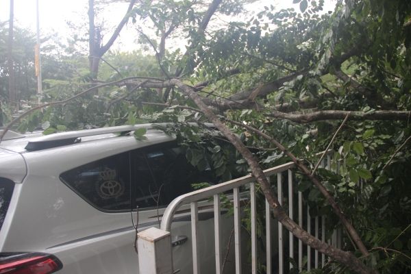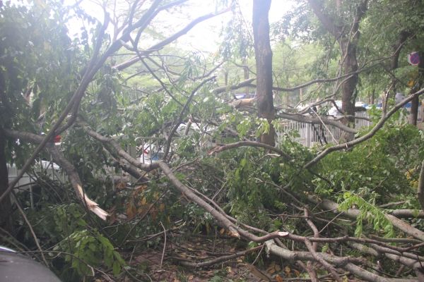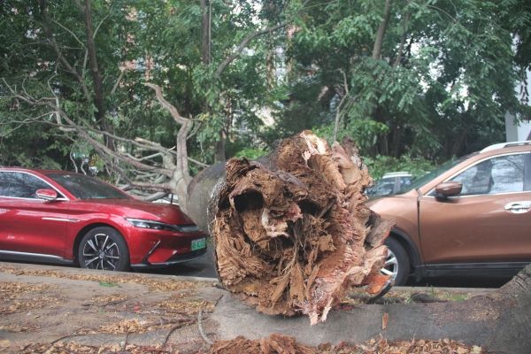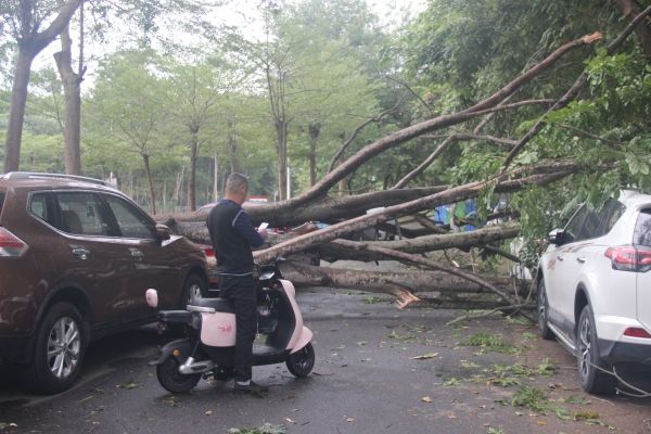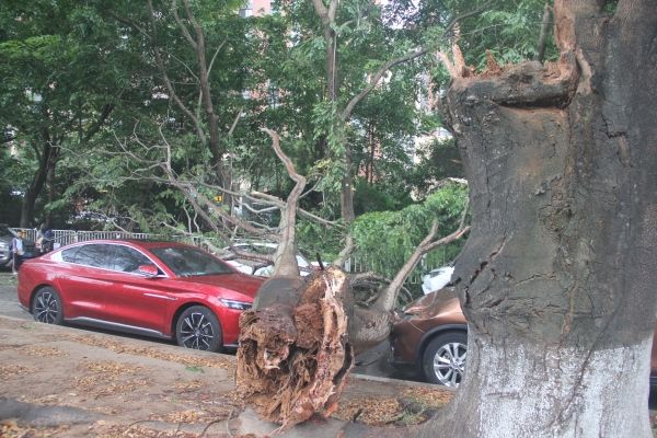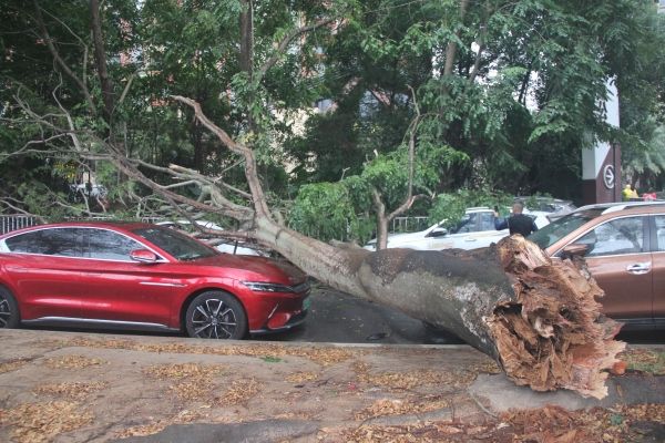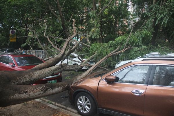 广东东莞:受台风“尼格”影响 树干断裂砸向车辆