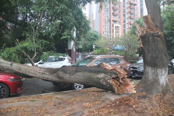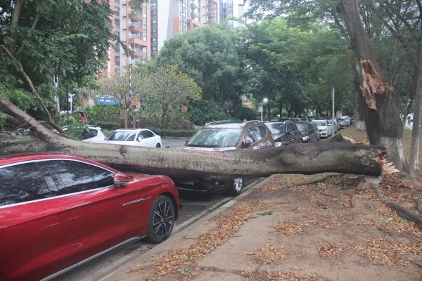 2022年11月2日,广东省东莞市,受台风“尼格”影响,一棵大树的树干断裂,砸到在树下停放的几辆汽车。