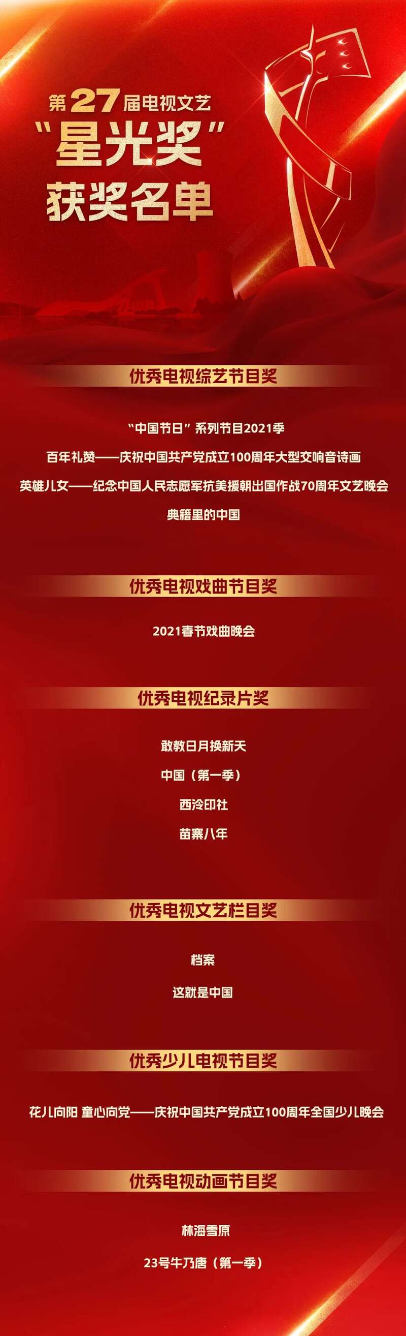本届“星光奖”评选出的14部获奖作品紧扣宣传主题主线,在内容和表达创新方面取得了较大成绩。《典籍里的中国》《中国(第一季)》等对中华优秀传统文化的创新演绎得到观众肯定,《“中国节日”系列节目2021季》等在科技与艺术的结合上进行了可喜的探索。