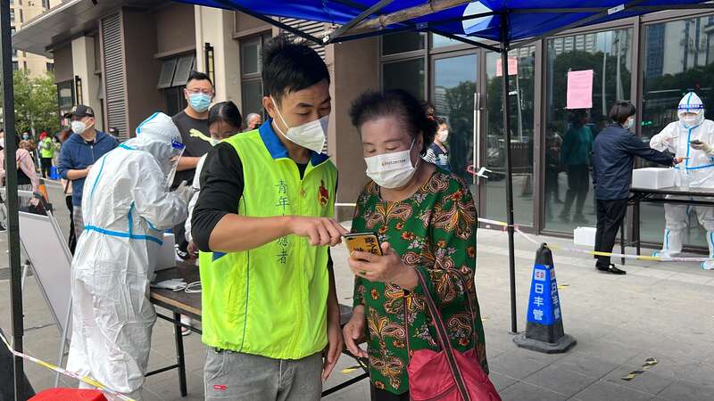 福州市晋安区的青年志愿者协助老年居民使用扫码进行核酸检测。团福州市委供图