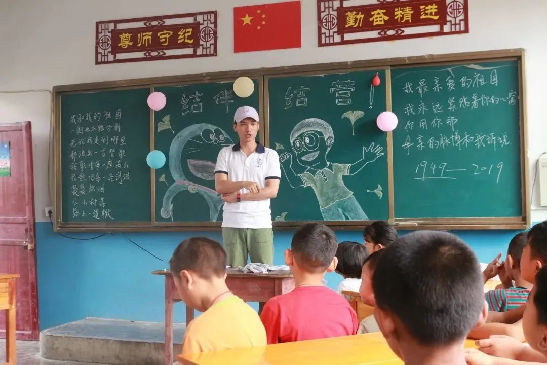 李奕衡的自立自强给自己的家庭减轻了负担,还给更多其他的人带去了帮助。在完成2019年军训带训的工作后,作为社会实践项目负责人的他便带着志愿实践团队的小伙伴们去到贵州省铜仁市沿河县官洲镇木梓岭村的大山里,走访了解扶贫政策,给当地孩子们开展了一次别样的教学。