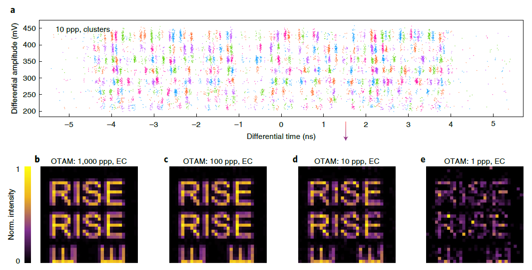 吴培亨院士领导的南京大学超导电子学研究所 提出了一种正交时间-幅度复用读出方式(orthogonal time–amplitude multiplexing, OTAM)。通过引入了第二个幅度测量维度,补偿了时间测量上的不确定性。该团队实现了1024 像素(32 × 32)的超导纳米线单光子成像器件。像素空间分辨率为12.6 微米。相比仅采用时间复用读出方式 (Zhao, Q.-Y. et al. Nat. Photonics (2017).),器件的分辨率和像素规模提升了8倍。该工作为实现大规模超导纳米线单光子探测器(SNSPD)阵列提供了一条高效的读出方式。