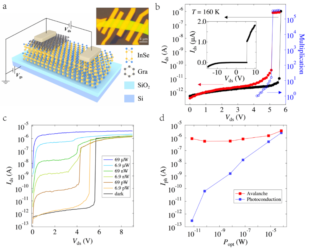 (a)graphite/InSe雪崩探测器示意图。插图:器件光学图像。(b)温度在160K时,对数标度下的电流-偏压(Ids-Vds)特性曲线(黑线,黑暗状态下;红线,6.9 pW的532 nm激光照射下),以及相应的雪崩增益曲线(蓝线),相应的纵坐标轴由箭头标识。插图:覆盖了负偏压范围的线性标度下的Ids-Vds特性(黑暗状态)。(c)6.9 pW至69μW激光功率范围内测量的Ids-Vds特性曲线。(d)Vds为5.5V时雪崩模式下的光电流Iph(红线)和Vds为2V时光导模式下的光电流Iph(蓝线)作为激光功率的函数。