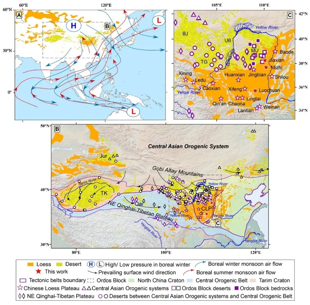 黄土高原的位置及其与潜在的物源区的联系。其中,橙黄色区域是黄土堆积区