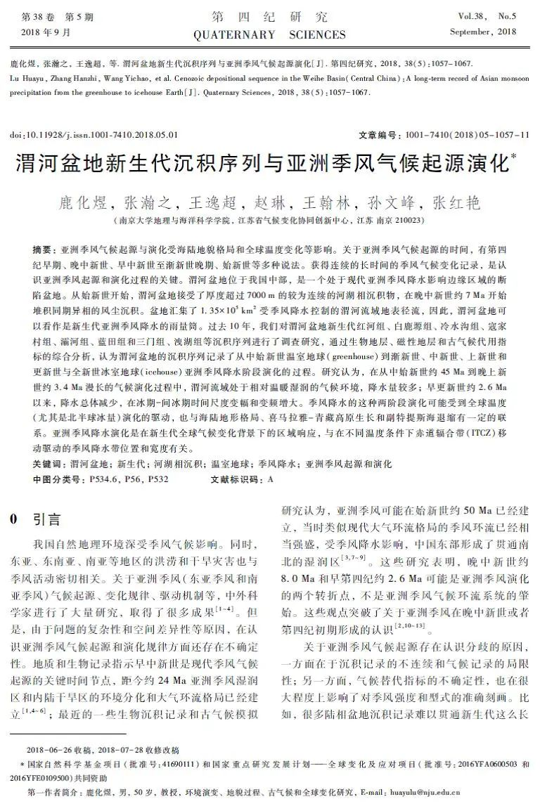 10月8日,中国科协公布第七届优秀科技论文遴选计划入选论文,地理与海洋科学学院鹿化煜教授等发表在《第四纪研究》2018年第5期的文章《渭河盆地新生代沉积序列与亚洲季风气候起源演化》入选。论文结合渭河盆地新生代沉积序列完备和时间分辨率高的优势,开展了季风演化的系统性研究。论文取得了创新性成果,是我国地貌、第四纪地质与新生代环境演变领域重要的研究进展,获得了珍贵的材料并提出了新生代季风演化过程和机制的新假说。