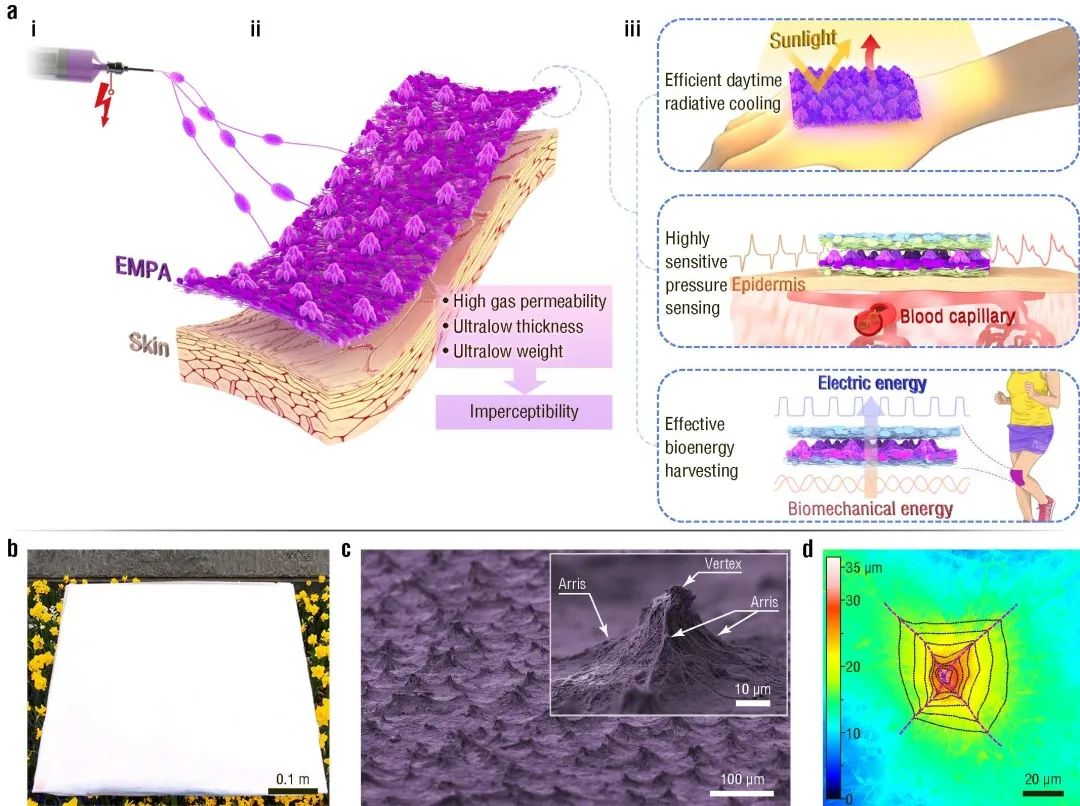 电子科学与工程学院潘力佳、施毅教授团队在电子皮肤器件领域取得重要进展。该研究团队研制出一种电纺自组装微金字塔阵列膜,该膜具有超薄、超轻、透气的结构及良好的光、热、力、电性能,赋予舒适型贴合皮肤器件在日间辐射制冷、压力传感和生物能收集等领域优良的性能表现。该工作为开发具有卓越性能和无感性的下一代贴合皮肤器件提供了一种通用且可升级的策略,满足了贴合皮肤器件在诸多场景中严苛的应用需求。