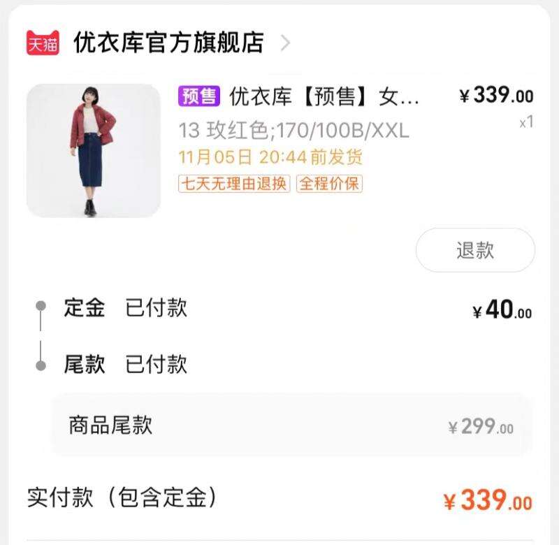 北青报记者发现,拥有类似经历的消费者并不在少数。有消费者表示,自己在天猫“优衣库官方旗舰店”买了一款男装羽绒服,预售定金80元,尾款750元,其中优惠券减掉了33.95元,自己实付款764.71元。谁知,双11商品一正式开售,商家又出一个满500减50的优惠券,这样算下来又比自己原先购买的便宜16.05元。另一位消费者同样在该店铺购买了一款女士羽绒服,定金40元,尾款299元,实付款339元,结果最终商品开售后店铺又上线30元优惠券,这件衣服仅309就可以购买了,差价30元。