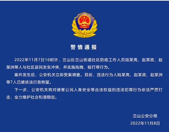 山东临沂兰山公安分局11月8日在其微信公众号上通报,11月7日16时许,兰山区兰山街道社区防疫工作人员陆某亮、赵某政、赵某洲等人与社区居民发生冲突,并实施拖拽、殴打等行为。