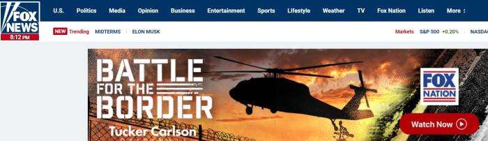 保守派美媒福克斯新闻网打出了“为边境而战”的标语,主持人是抨击过拜登的塔克·卡尔森。图片来源:福克斯新闻网页面截图