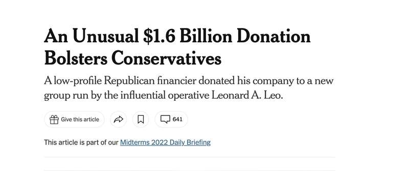 据《纽约时报》披露,一位不知名的电子制造业大亨巴里·赛德在过去两年以股票捐赠的形式,向美国保守派政治活动人士莱昂纳多·利奥领导的右翼团体“大理石自由信托基金”捐赠了16.5亿美元。这是美国有史以来已知的最大一笔“黑金”,是“里程碑式”捐赠。
