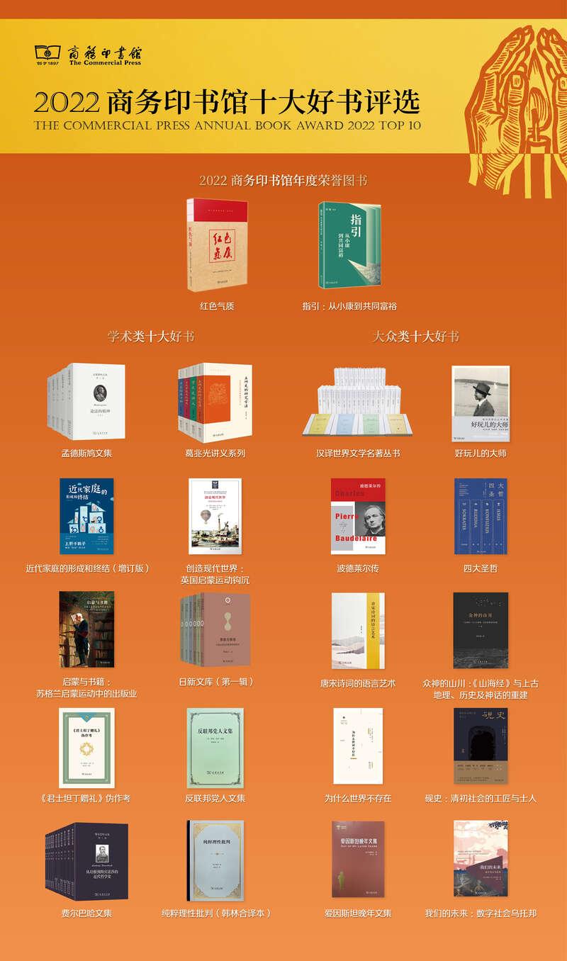 中国青年报客户端讯(中青报·中青网记者 沈杰群)11月9日,2022商务印书馆十大好书在京发布。《红色气质》《指引:从小康到共同富裕》被评为“年度荣誉图书”;《孟德斯鸠文集》《葛兆光讲义系列》等获评年度学术类十大好书;《汉译世界文学名著丛书》《好玩儿的大师》等获评年度大众类十大好书。