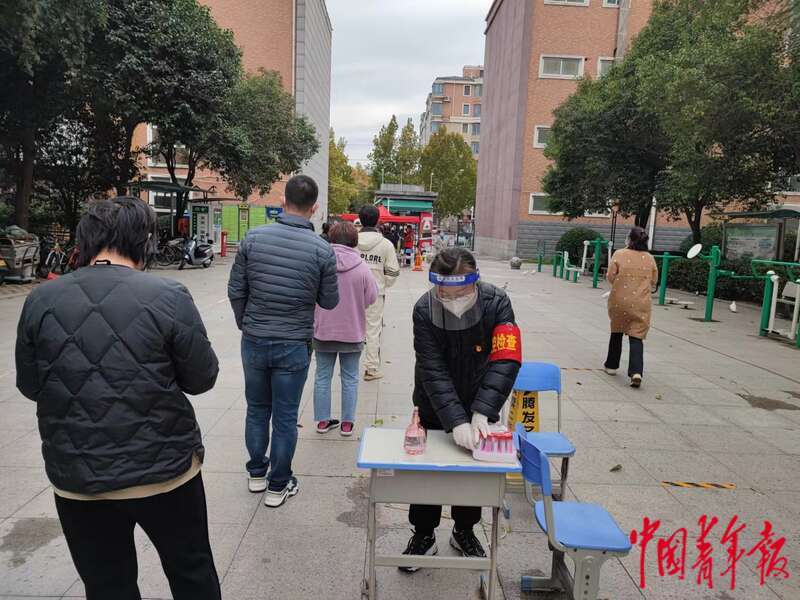11月12日,郑州市郑东新区某小区居民在排队做核酸检测。中青报·中青网记者 潘志贤/摄