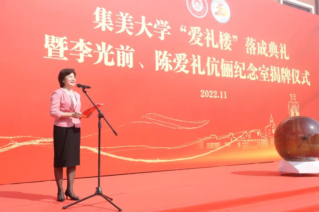 集美大学校长李清彪致辞。他指出,“爱礼楼”的落成和“李光前、陈爱礼伉俪纪念室”的揭牌,展现了李光前、陈爱礼伉俪及其后人心系桑梓、热爱祖国、为祖籍国文化教育事业无私奉献的精神情怀,是嘉庚精神在新时代的继承和发扬。李氏基金的真情义举,将滋养着一代又一代的嘉庚学子,心怀感恩、胸怀家国,勇毅前行,也将激励着我校全体师生员工秉持诚毅之心,不断深化内涵建设,提高办学水平,奋进新时代新征程,齐心共赴建设“工海”特色更加鲜明的一流大学目标。