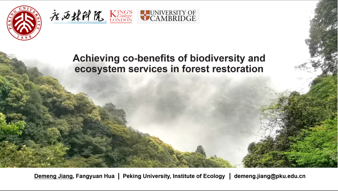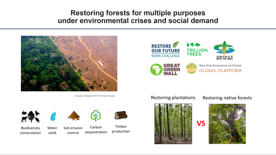 森林恢复是应对气候变化、生物多样性丧失、水土流失等挑战的重要途径。国内外启动了许多大型森林恢复项目,但被恢复的森林在实现各大生态目标上成效如何?森林恢复的生态成效与木材生产功能是否存在权衡?人们如何协调该权衡关系、实现多种目标的共赢?这些都是亟待回答的问题。