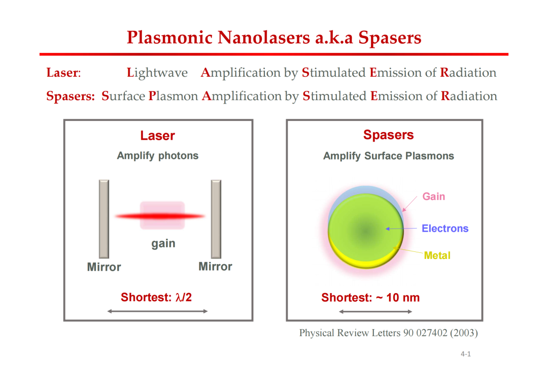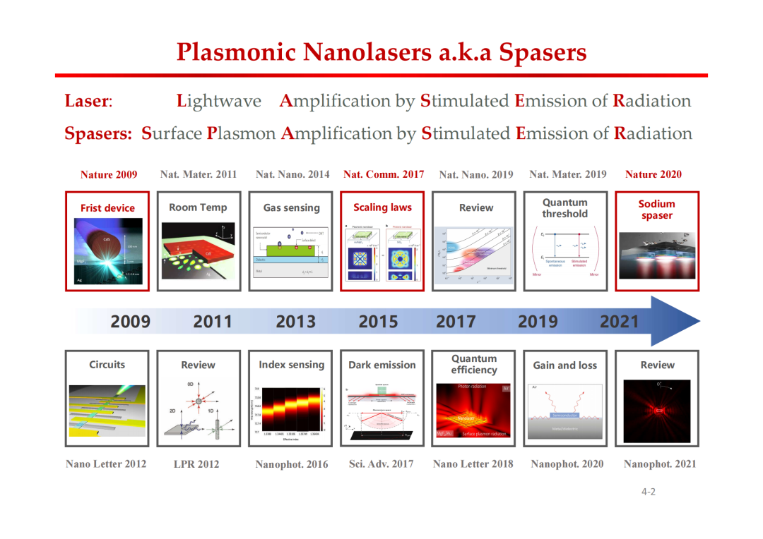 激光的发明加深了人们对光与物质相互作用的认识,并极大地推动了现代科学与技术的发展。自激光发明以来,其微型化一直是激光领域核心研究方向之一,目的是为了获得体积更小、速度更快以及能耗更低的激光。经过几十年的发展,微型化激光已经取得了巨大的成就,成为了信息通信、光传感、消费电子等领域的核心驱动光源。然而在激光中增益介质是通过受激辐射放大光子,因而激光尺寸受光学衍射极限的限制,每个维度最小的尺度均要大于半个波长。光学衍射极限的存在阻碍了激光的进一步微型化。