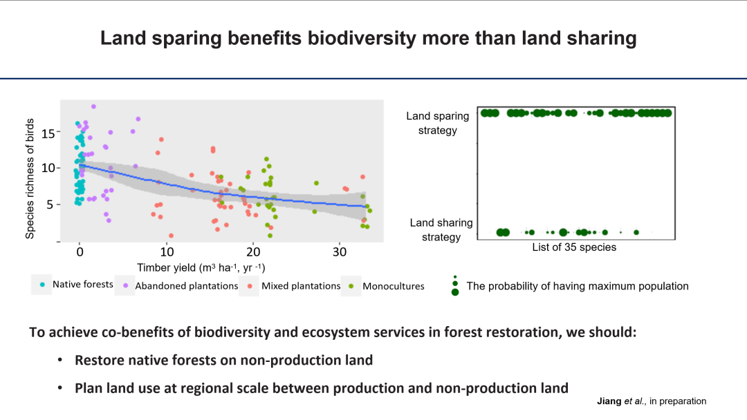 蒋德梦是北京大学生态研究中心华方圆助理教授课题组的博士后,此次代表课题组在科学家青年论坛中作报告。华方圆课题组首先通过汇总全球数据集,量化评估了人工林与自然林两大类被恢复森林在储碳、保土、产水、保护生物多样性、生产木材上的成效差别。分析发现,在各生态成效上,恢复自然林比营建人工林都有突出优势,但营建人工林有明显的木材生产优势。因此森林恢复在生态与生产成效的实现之间存在不容忽视的权衡。鉴于该权衡关系,他们进而通过在我国木材生产第一大区广西开展野外研究,通过对一系列森林恢复和管理方式进行鸟类和木材产量调查,以区域尺度土地分配规划的视角探究在满足木材生产前提下,能最大化生物多样性保护的土地利用策略,以期为协调森林恢复的生态与生产成效权衡提供科学依据。初步分析显示,通过在区域尺度将土地在自然林恢复与高产人工林营建之间进行恰当分配,将是解决森林恢复生态与生产权衡挑战的有效出路。