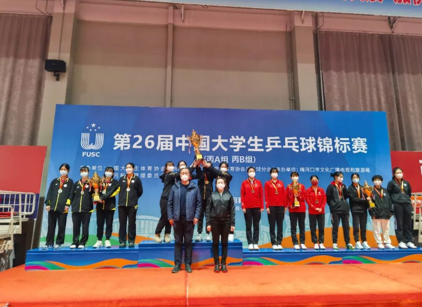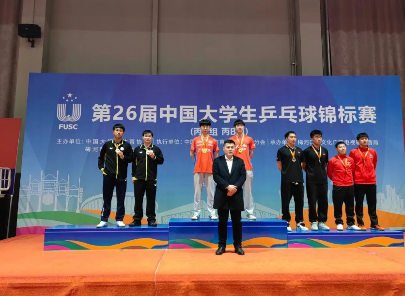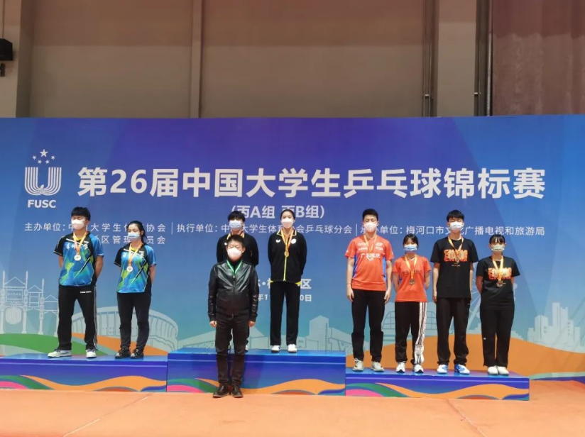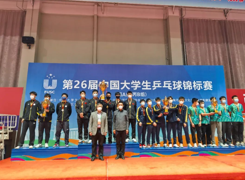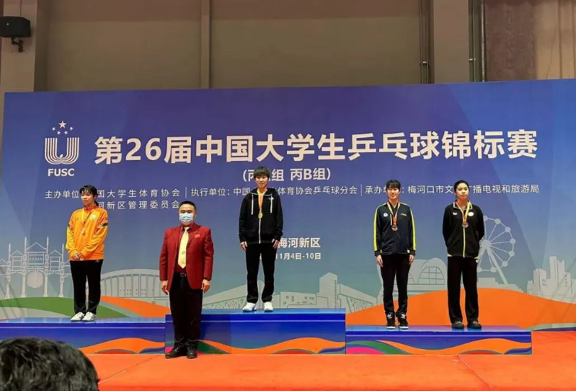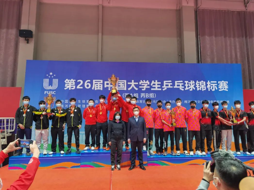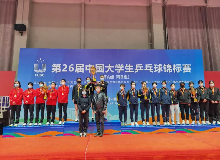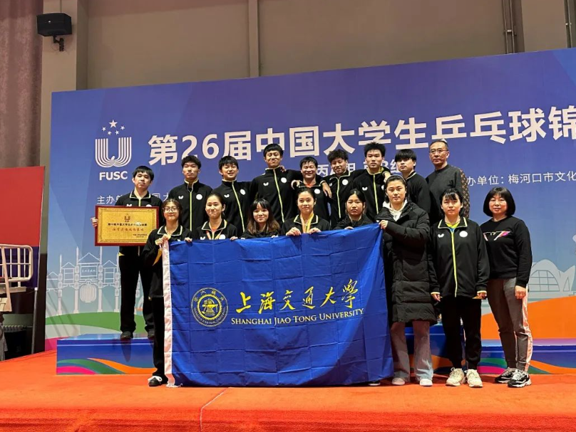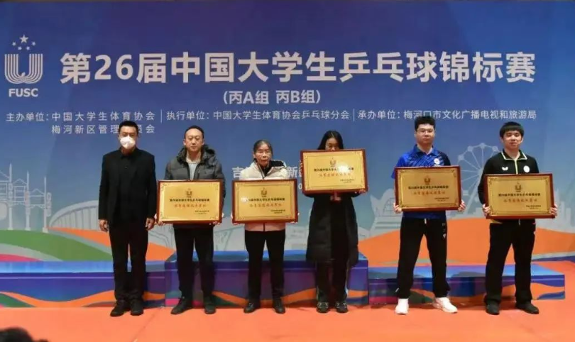 2022年11月10日,第26届中国大学生乒乓球锦标赛(丙A、丙B组)在吉林省梅河新区梅河口市体育中心圆满落幕。本届比赛为期6天,共有来自全国23所高校的300余名选手参赛,本届比赛设有男子团体、女子团体、男子单打、男子双打、女子单打、女子双打、混合双打,两个组别14个项目。11月5日至7日进行各组别团体赛争夺,采用小组循环和淘汰赛制;11月8日至10日,开展各单项比赛角逐,均为单淘汰赛制。上海交通大学高水平乒乓球队最终获得2金5银2铜的优异成绩,同时,球队获得体育道德风尚奖,教练员丁松获得教练员体育道德风尚奖。
