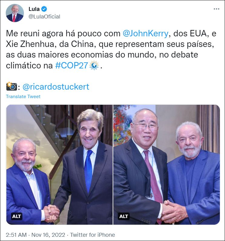 卢拉16日发推表示,已同参会的中国气候变化事务特使解振华和美国气候特使约翰·克里,并配上与两人的合影。
