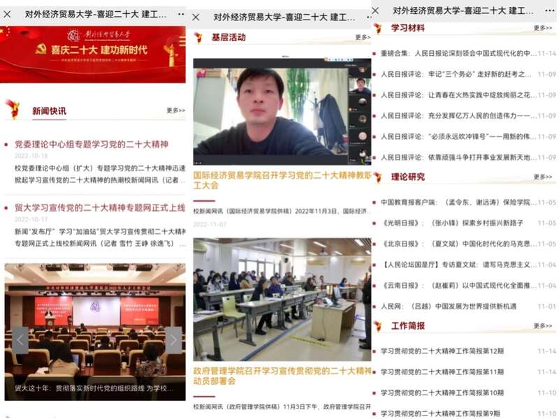 对外经济贸易大学统筹校内各级各类新闻媒体宣传资源,充分利用新闻网、校报、广播电视、微信微博、橱窗展板等全媒体平台,全面宣传解读大会精神,设立网络专栏,刊发理论文章、学习体会,宣传典型经验。同时,以微党课、主题展览、“网络巡讲”等方式,营造校园“学习贯彻二十大”的浓厚氛围。
