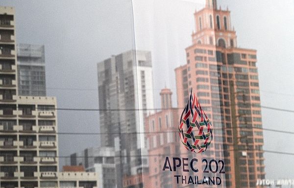 当地时间2022年11月17日,泰国曼谷,新闻中心,亚太经合组织领导人会议周的标志。