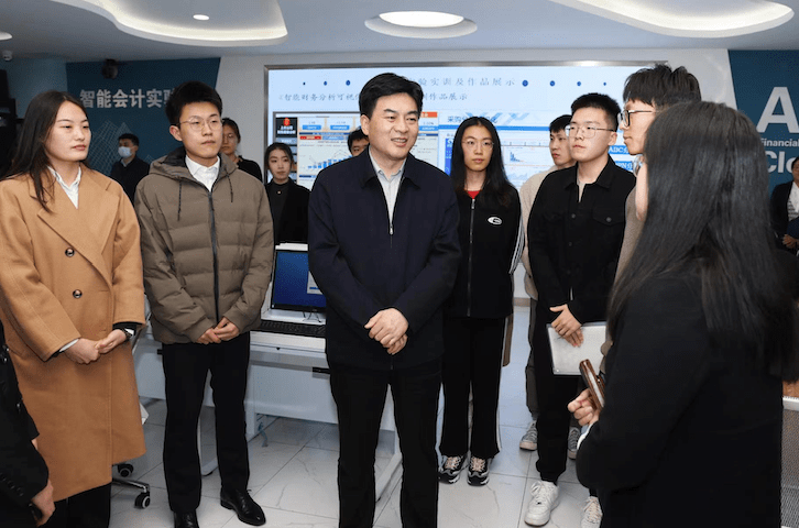 宣讲结束后,刘天东来到山东财经大学会计学院智能会计实验室,参观了《职能财务分析可视化》课程实验实训作品展示,并与现场的青年学生交流起学习党的二十大精神的方式方法。
